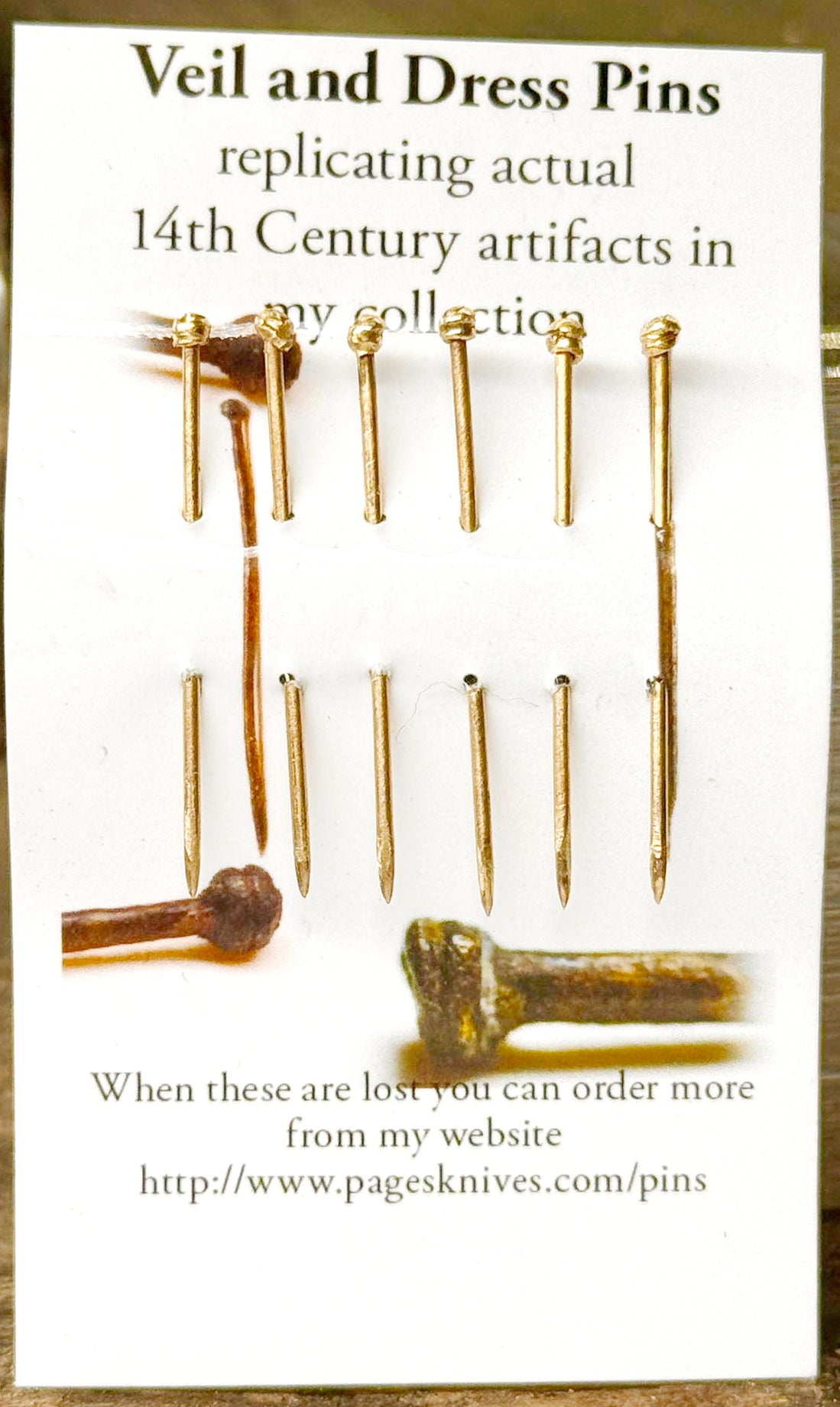 Pins, based on 14th Century artifacts in my collection. The heads are swaged 2 1/2 turns of wire just like the artifacts. The pin shanks and points are individually work hardened to make them bend resistant, also the points have the same convex shape as the veil pin artifact, which adds to the strength of the point.
